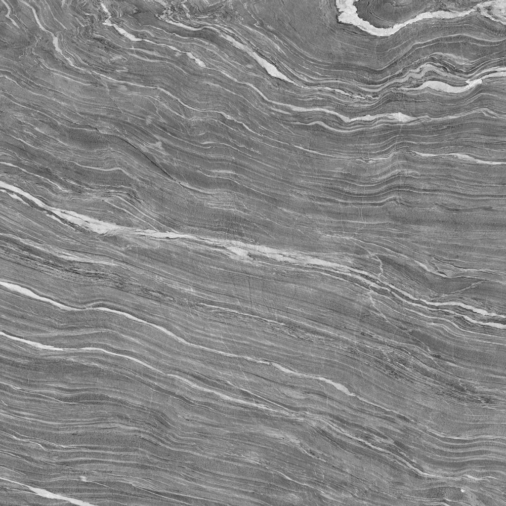 As estrias mais brancas e um cinza mais claro são conseguidas com uma técnica especial que dá textura às veias. Além disso, as partículas brilhantes em toda a pedra também dão um belo efeito perolado.