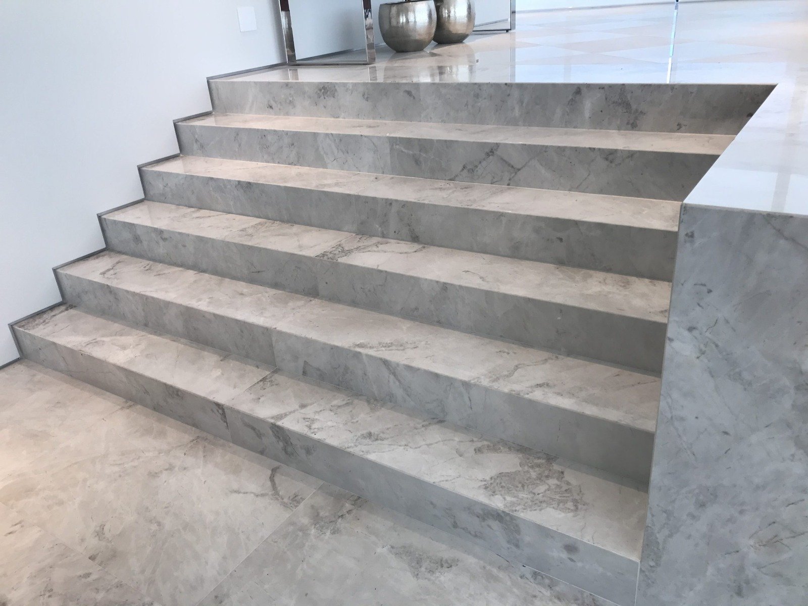 O mármore Branco Paraná tem fundo em tom rosado e veios em tons de cinza.