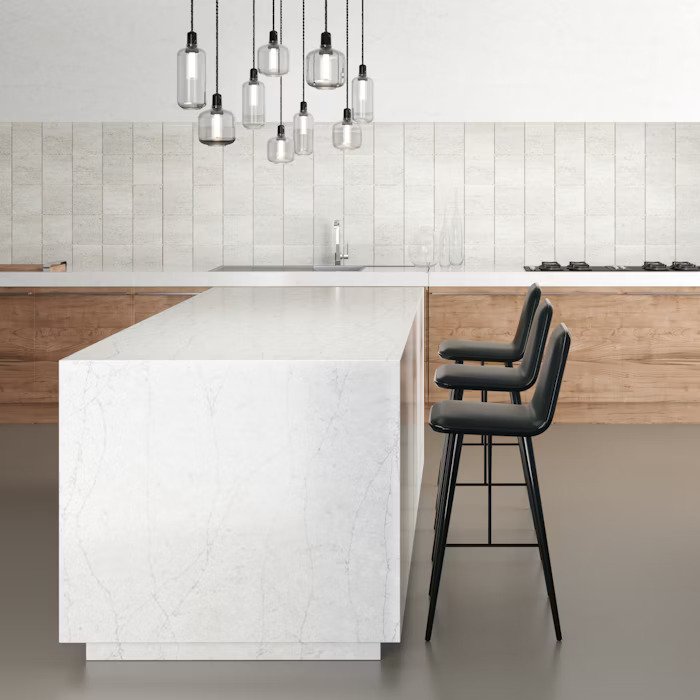 Um calcário branco e coberto com veios cinzentos subtis, o que cria um impressionante efeito fendido. Este modelo adapta-se perfeitamente às cozinhas clássicas e rurais e àqueles que pretendem recriar uma leve sensação de tradição.